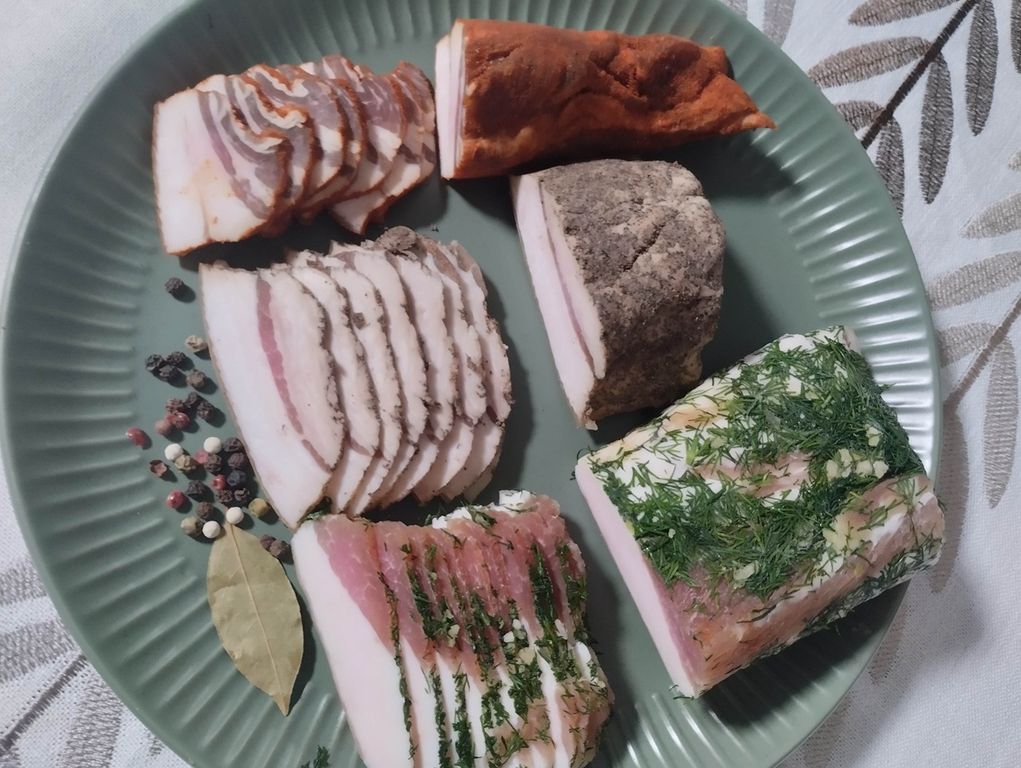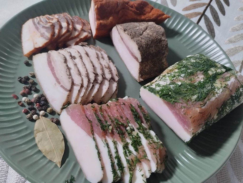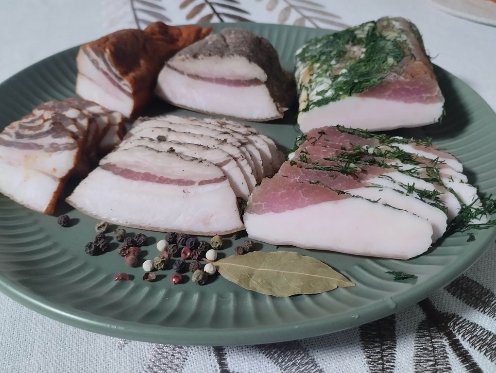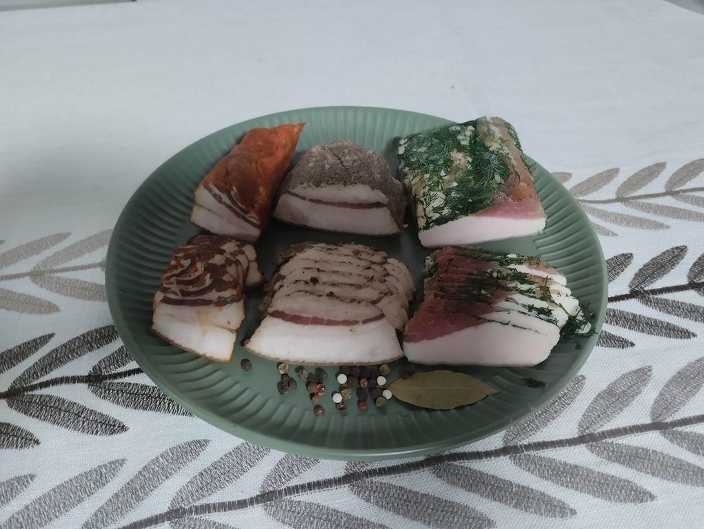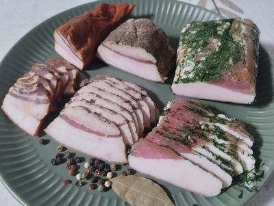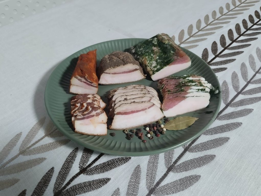 Сало фермерское по-домашнему со специями, ассорти из 3х видов: