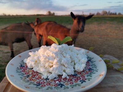 Козий творог это наиболее популярный кисломолочный продукт, который мы изготавливаем из молока наших фермерских коз на свободном выгуле. Козье молоко у нас всегда первой свежести и высшего качества. В домашних условиях козий натуральный творог всегда вкуснее и полезнее заводского, т.к. сохраняет все необходимые для человека живые организмы.