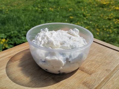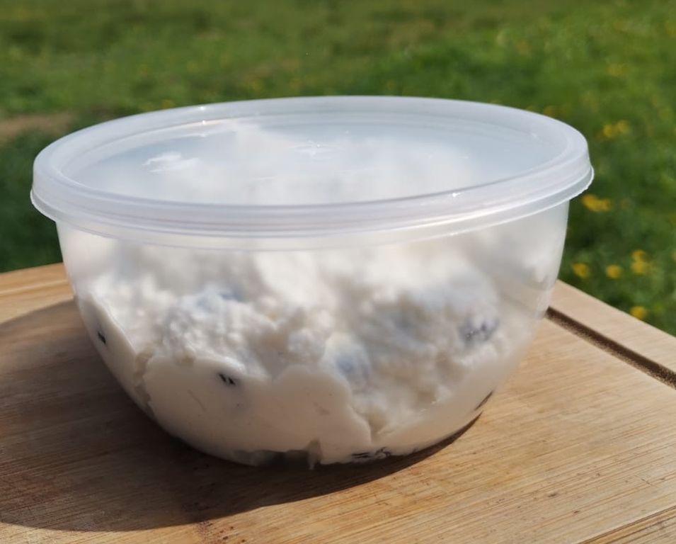 Творожная масса с изюмом из козьего молока - известный и многими любимый сладкий творожный десерт. На нашей ферме мы заботимся, чтобы творог с изюмом получился качественным продукт. Творожная масса из козьего молока с нашего фермерского хозяйства сделана нами из молочка наших коз чешской породы, которых кормим мы качественными кормами с наших полей, травка на которых растет летом очень активно. Всё натурально! Допустим, Вы захотите сами сделать творожную массу из козьего молока, что надо делать? Сначала надо сделать сам козий творог из цельного фермерского молока, а это не так просто. Если взять обычное молоко, то очень легко ошибиться, и получится не творог, а творожный продукт. Вы хотите максимально вкусно и полезно? Фермерское козье молоко довольно жирное и от этого зависит вкус, качество и количество творога, поэтому чем жирнее, тем лучше. Попробовав настоящую творожную массу на жирном козьем молоке, Вы наверняка придете к нам снова. Не забывайте, что промышленные масштабы, рассчитанные на миллионы тонн, всегда будут ставить минимальные затраты и экономию на первое место. А если хочется максимально здоровый и натуральный продукт, то нужно обращаться к людям, которые сами выращивают и производят натуральные продукты, отвечают за это своей репутацией, поэтому делают всё как для себя. Ну что, делаем творожную массу из козьего молока? Берём цельное козье молоко, нагреваем его в кастрюле из алюминия или нержавеющей стали с толстым дном. Эмалированная посуда не подойдёт: в ней всё может пригореть. Козий творог выкладываем на дуршлаг, застеленный несколькими слоями марли. Под дуршлаг ставят кастрюлю или какую-либо другую ёмкость, чтобы туда стекала сыворотка. Если оставить творог в дуршлаге на пару часов или даже меньше, то он получится влажным. Чтобы сделать творог сухим и рассыпчатым, нужно завязать концы марли и подвесить узелок над раковиной или кастрюлей на несколько часов или даже на всю ночь. Время зависит от некоторых вкусовых предпочтений: чем дольше стекает сыворотка, тем суше будет козий творог. А чтобы творог держал форму, можно положить на него груз. Творог из натурального козьего молока готов.